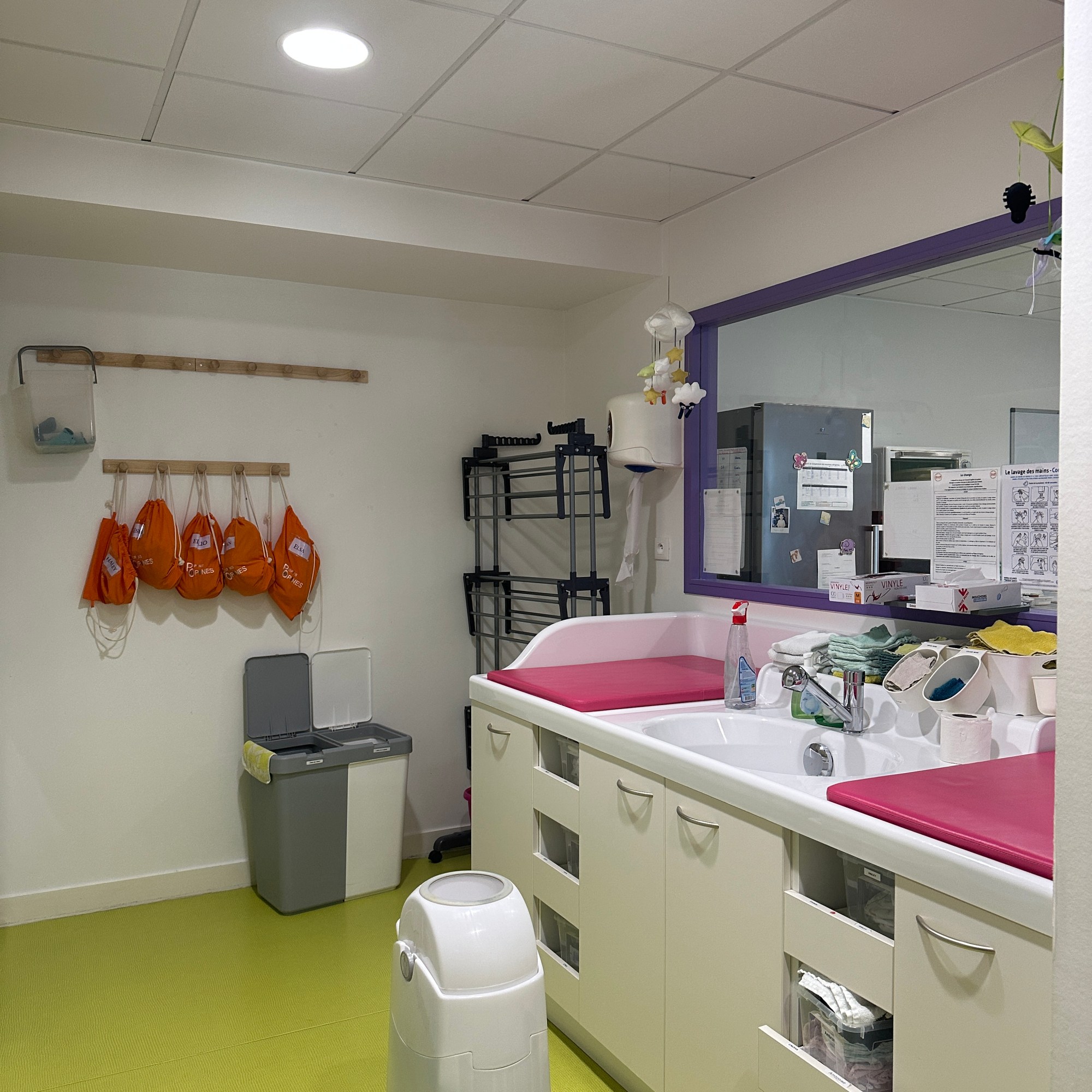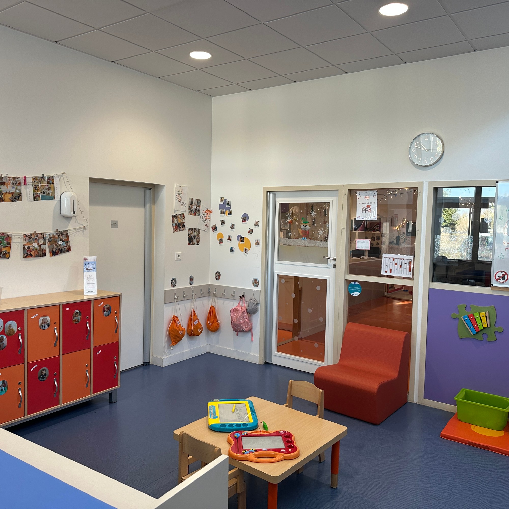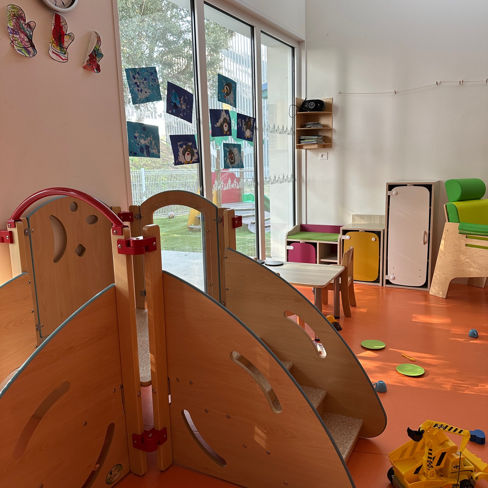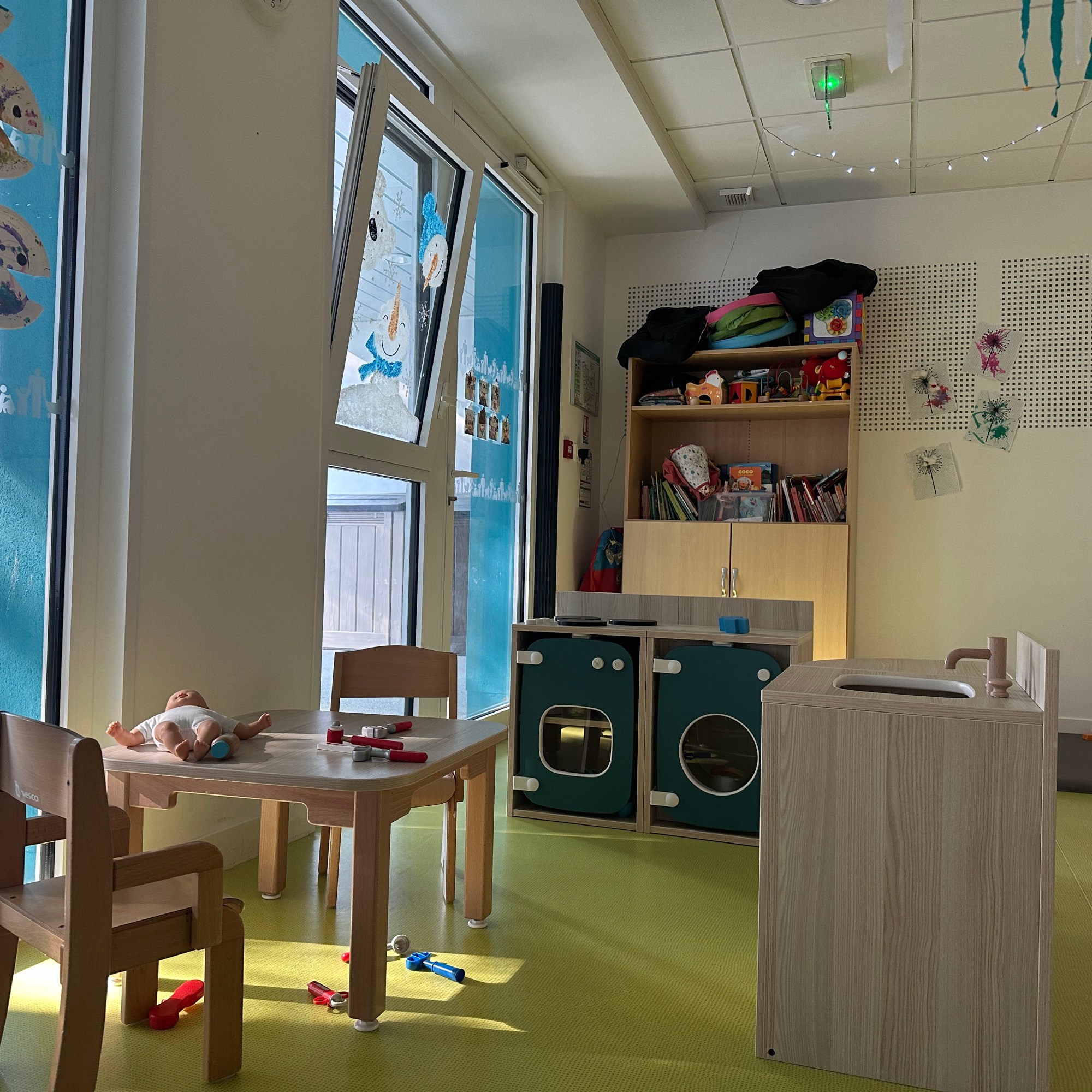 La micro-crèche est aux côtés des PP2, et partage avec elle, son jardin extérieur, sa salle de motricité et le hall d’accueil des familles.